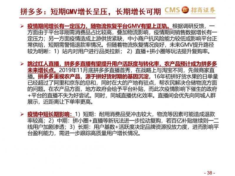 本次疫情對電商影響短期或出現分化,有物流運力支持的京東保持穩健增速,其他平臺短期增長承壓;長期來看隨物流恢復速度加快,線上滲透持續上行,利好綜合電商平臺。