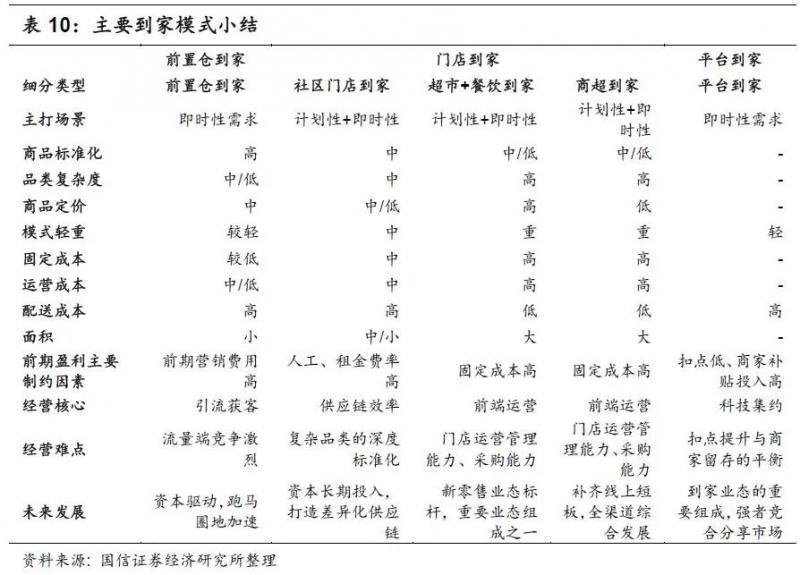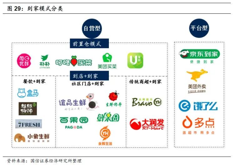 目前到家模式(主要指即時(shí)配送到家)主要分自營(yíng)型以及平臺(tái)型,其中自營(yíng)模式下包含前置倉(cāng)、門(mén)店+到家兩類模式;平臺(tái)型則指第三方開(kāi)放平臺(tái)為線下門(mén)店賦能,提供即時(shí)到家配送服務(wù),比如:京東到家、多點(diǎn)等。
