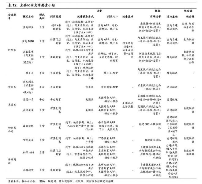 阿里系與美團(tuán)系擁有流量、數(shù)據(jù)等先發(fā)優(yōu)勢(shì),未來(lái)突出重圍需要將流量經(jīng)營(yíng)邏輯向商品經(jīng)營(yíng)邏輯轉(zhuǎn)換,深耕供應(yīng)鏈;傳統(tǒng)商超到家業(yè)務(wù)突破需要與互聯(lián)網(wǎng)龍頭合作,補(bǔ)齊流量、數(shù)據(jù)劣勢(shì),完善全渠道布局;而以每日優(yōu)鮮為代表的初創(chuàng)類在到家業(yè)務(wù)市場(chǎng)上已經(jīng)擁有一定的規(guī)模優(yōu)勢(shì),在流量、數(shù)據(jù)與供應(yīng)鏈方面均有一定的積累,長(zhǎng)期發(fā)展需要資本持續(xù)投入,三者協(xié)同發(fā)展方能對(duì)抗互聯(lián)網(wǎng)龍頭到家業(yè)務(wù)崛起的威脅,穩(wěn)住市場(chǎng)份額。