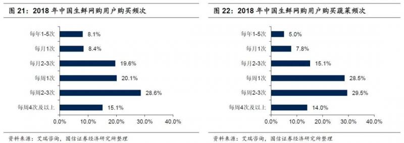 消費(fèi)習(xí)慣轉(zhuǎn)移:據(jù)艾瑞咨詢調(diào)研數(shù)據(jù),每周購(gòu)買(mǎi)1次以上的生鮮網(wǎng)購(gòu)用戶占比達(dá)63.8%,每周購(gòu)買(mǎi)1次以上蔬菜的用戶占比72%,消費(fèi)者網(wǎng)購(gòu)生鮮的習(xí)慣已經(jīng)逐漸養(yǎng)成,未來(lái)隨著業(yè)態(tài)成熟,線上消費(fèi)頻次預(yù)計(jì)有較大的提升空間。