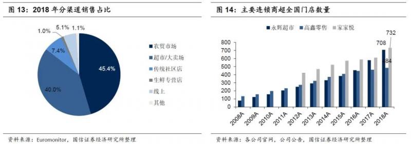 3)下游:農(nóng)貿(mào)市場(chǎng)仍占主導(dǎo);連鎖超市、新零售業(yè)態(tài)擴(kuò)張加速中
