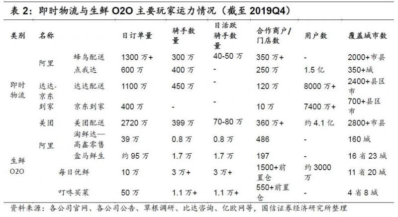 以美團(tuán)、阿里、京東為代表的互聯(lián)網(wǎng)巨頭搭建了完善的配送體系,截至2019年底,即時(shí)配送市場(chǎng)呈三足鼎立局面,其中阿里系(餓了么蜂鳥(niǎo)+盒馬+點(diǎn)我達(dá))、美團(tuán)系(美團(tuán)外賣(mài))、京東系(達(dá)達(dá)快送+京東到家)分別覆蓋2000+/2800+/2400+(其中京東到家覆蓋700+)縣區(qū)市,日均訂單量分別約達(dá)2034萬(wàn)/2720萬(wàn)/1500萬(wàn),完善的即時(shí)配送網(wǎng)絡(luò)為生鮮到家服務(wù)提供了基礎(chǔ)。