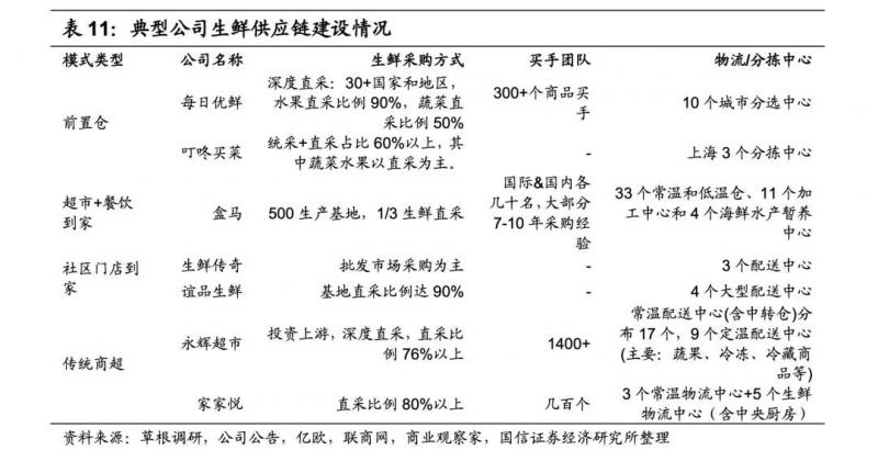 3)供應(yīng)鏈:對(duì)比而言,傳統(tǒng)商超在供應(yīng)鏈優(yōu)勢(shì)(買(mǎi)手?jǐn)?shù)量/經(jīng)驗(yàn)+直采比例+物流/分揀中心等)方面優(yōu)勢(shì)顯著。相較傳統(tǒng)商超,互聯(lián)網(wǎng)龍頭以及初創(chuàng)類公司由于入局時(shí)間晚、生鮮規(guī)模較小,在生鮮供應(yīng)鏈方面短板明顯,需要長(zhǎng)期持續(xù)投入,提升供應(yīng)鏈效率,進(jìn)而改善經(jīng)營(yíng)模型。