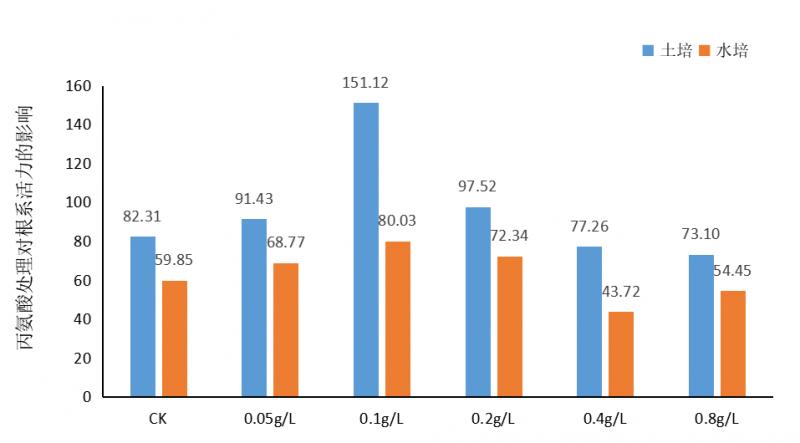 本試驗結果另一方面表現(xiàn)為,根系重量及根系活力隨L-丙氨酸濃度的增加,呈現(xiàn)先上升后下降的趨勢,0.05g/L-0.2g/L濃度下表現(xiàn)最高均高于對照,但在超過該濃度范圍后對幼苗根系發(fā)育產(chǎn)生抑制作用。氨基酸中含有作物生長發(fā)育所需的營養(yǎng)元素及大量游離氨基酸、蛋白質、糖分等活性有機小分子物質,可直接被作物根系吸收,促進根系生長發(fā)育,間接增強地上部生長效果,發(fā)揮增效作用[4,8,9]。