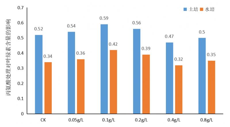 在水培條件下,0.1g/L丙氨酸處理下葉綠素含量最高,可達0.424spad,其次為0.2g/L、0.05g/L,與對照相比,葉綠素含量分別提高19.05%、12.82%、5.56%。其他濃度處理下葉綠素含量均低于對照。