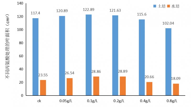 在水培條件下,0.1g/L-0.8g/L處理范圍內隨著丙氨酸含量增加葉面積呈先上升后下降趨勢,峰值出現(xiàn)在0.2g/L處理為28.89cm2,0.05g/L、0.1g/L、0.2g/L丙氨酸處理下黃瓜幼苗葉面積均高于ck,分別提高12.69%、18.39%、18.48%;在0.4g/L、0.8g/L丙氨酸處理下黃瓜幼苗葉面積較ck分別降低12.27%、23.18%。