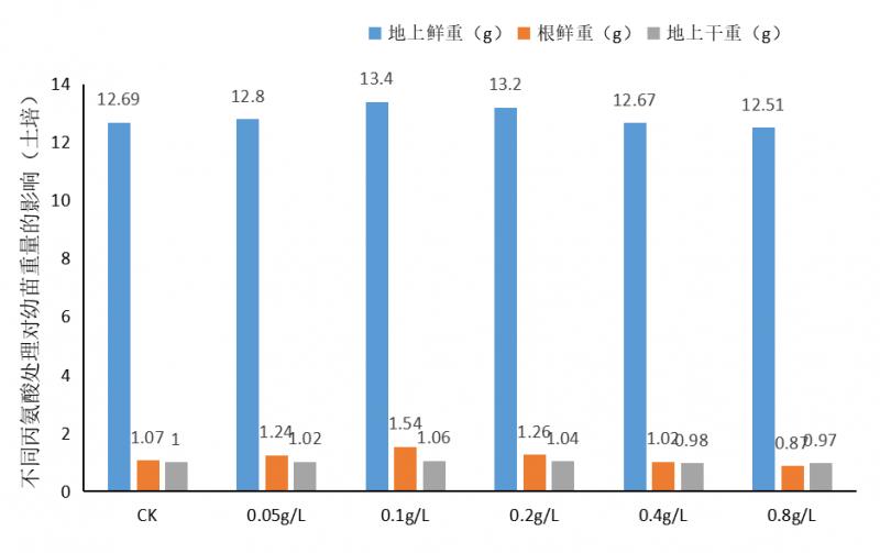 由圖3可知,在土培條件下,0.1g/L-0.8g/L處理范圍內隨著丙氨酸含量增加地上鮮重、根鮮重、地上干重均呈先上升后下降趨勢,峰值均出現(xiàn)在0.1g/L處理,分別為13.4g、1.54g、1.06g。與CK相比,在0.05g/L、0.1g/L與0.2g/L丙氨酸處理下,地上鮮重分別提高0.86%、5.5%、3.86%,根鮮重分別提高13.71%、30.52%、15.07%,地上干重分別提高1.96%、5.66%、3.85%。