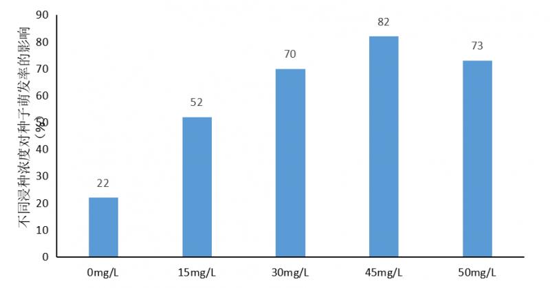 由圖1可知,在浸種處理下,隨著L-丙氨酸濃度的增加發(fā)芽率呈先上升后下降趨勢,在45mg/L濃度處理下達到峰值,為82%,較對照提高60%;當L-丙氨酸濃度增加至50mg/L時,萌發(fā)率下降。