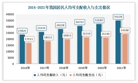 據統計,自改革開放以來,我國經濟持續健康快速發展,居民人均可支配收入與消費支出不斷提高。數據顯示,我國居民人均可支配收入35128元,比上年名義增長9.1%;居民人均消費支出24100元,比上年名義增長13.6%。