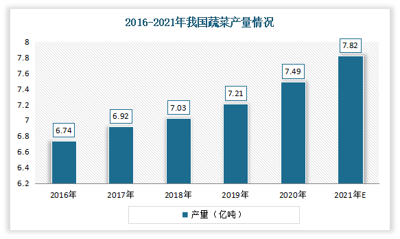 與播種面積走勢一樣,近年來我國蔬菜產量也逐年增長。數據顯示,2020年我國蔬菜產量由2016年6.74億噸增至7.49億噸,年均復合增長率為2.67%。預計2021年我國蔬菜產量可增至7.82億噸。
