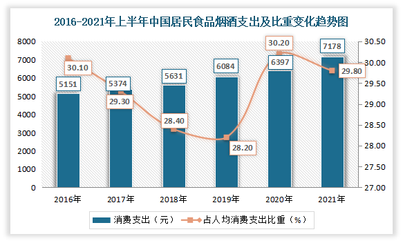 隨著居民消費支出不斷增長,我國基本生活消費支出也在不斷增加。根據數據顯示,2021年我國居民人均食品煙酒消費支出7178元,同比增長12.2%,占人均消費支出的比重為29.8%。其中全國居民人均谷物消費量131.4公斤,增長2.6%;人均蔬菜消費量109.8公斤,增長6.0%;人均肉禽消費量45.2公斤,增長20.5%;人均水產品消費量14.2公斤,增長2.6%;人均蛋類消費量13.2公斤,增長3.5%;人均奶類消費量14.4公斤,增長10.6%;人均干鮮瓜果類消費量61.0公斤,增長8.5%。