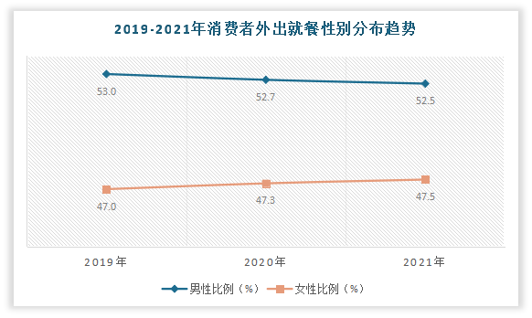 與此同時“她經濟”崛起帶動餐飲市場發展。根據相關數據顯示,近三年女性消費者外出就餐比例逐年增加。而根據國外研究表明,女性對餐飲消費決策的影響占比為85%,因此女性消費意愿對餐飲消費市場的影響不容忽視。2021年我國女性消費者外出就餐比例從2019年的47%增長到了47.5%。