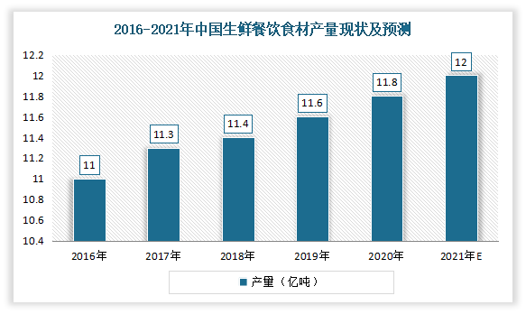 隨著政策利好以及消費者多元化需求,我國生鮮類食材需求不斷增加。數據顯示,2020年中國生鮮餐飲食材產量為11.8億噸,相對于2016年增加8000萬噸,同比增長7.2%。估計2021年我國生鮮餐飲食材產量將達12億噸。