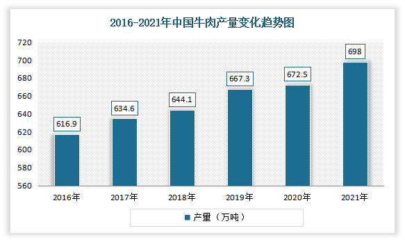 牛肉產量保持平穩態勢增長。數據顯示,2021年我國牛肉產量為698萬噸,同比增長3.8%。