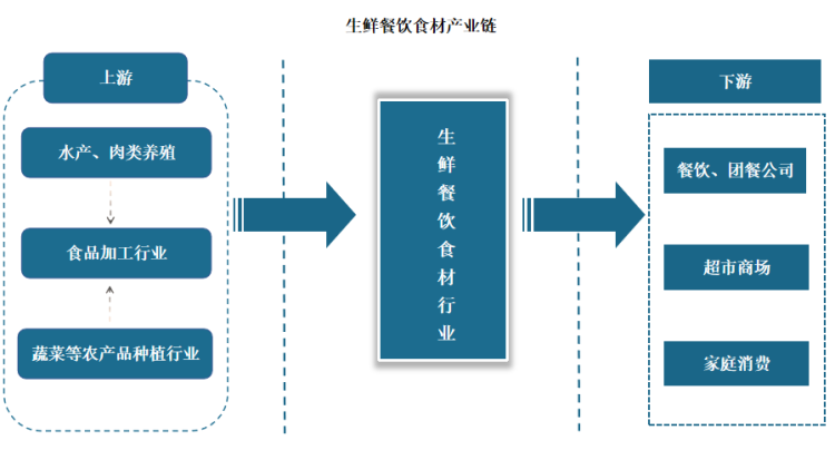 我國生鮮餐飲食材上游主要有水產、肉類養殖行業、蔬菜等農產品種植行業以及食品加工行業;下游主要包括餐飲、團餐公司、超市商超以及家庭消費等。
