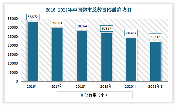 自2016年之后,由于電商平臺以及新零售的沖擊、運營成本的持續上漲、消費人口結構和消費訴求的轉變等因素的影響,實體超市零售業規模化發展受到制約,行業發展放緩。尤其是2020年受到疫情的沖擊,實體超市規模進一步收縮。但總體上來說,超市依舊是人們購物的主要場所之一。數據顯示,2016-2020年我國超市門店數量持續下降,到2020年我國超市門店總數只有24323個。估計2021年我國超市門店數量只有22218個。