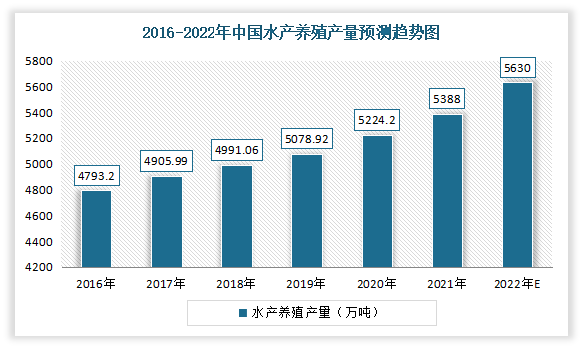 受益于人們對水產品的需求量不斷增長,我國水產養殖業得到了快速發展,產量呈現逐年增長態勢。數據顯示,截至2020年,我國水產養殖規模突破萬億大關,達到10223.4億元。2021年我國水產養殖產量從2016年的4793.2萬噸增長至5388萬噸。預計2022年我國水產養殖產量將進一步增長至5630萬噸。
