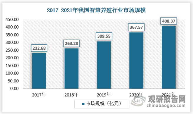 近年來隨著物聯(lián)網(wǎng)、大數(shù)據(jù)、傳感器等產(chǎn)業(yè)的發(fā)展,畜牧業(yè)的智慧化程度不斷提升,我國智慧養(yǎng)殖行業(yè)市場規(guī)模不斷擴(kuò)大,截止到2021年底,我國智慧養(yǎng)殖行業(yè)市場規(guī)模達(dá)到408.37億元。