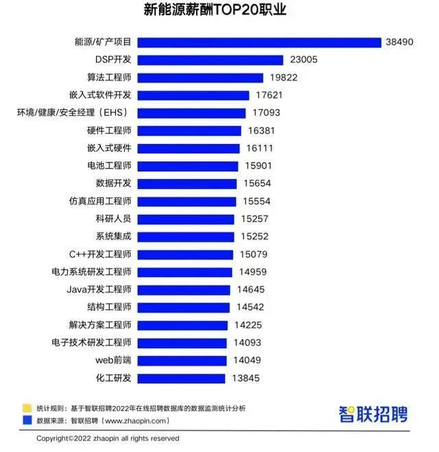 從薪資上看,新能源職位的薪資也高于全行業平均水平。