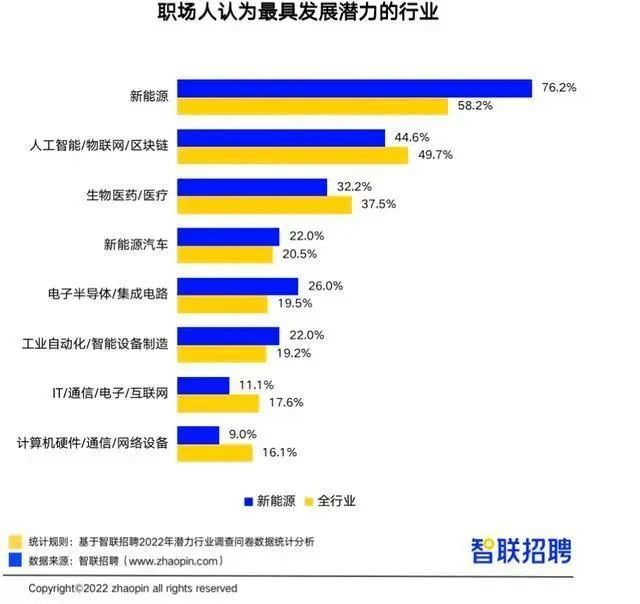 智聯招聘數據顯示,2022年1-5月,新能源產業招聘的職位數同比增長高達64.4%,遠高于全行業平均水平。更別說相對互聯網行業頻繁傳來的縮編、裁員消息,新能源賽道無疑十分火熱。