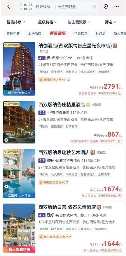 目前西雙版納經濟型酒店的價格已經突破千元,以西雙版納告莊西雙景搜索為例,同程App上1月22日至1月23日,除了個別兩三家在千元以下,其余均在千元以上,而且絕大多數高于1500元,甚至超過2000元的也不少。
