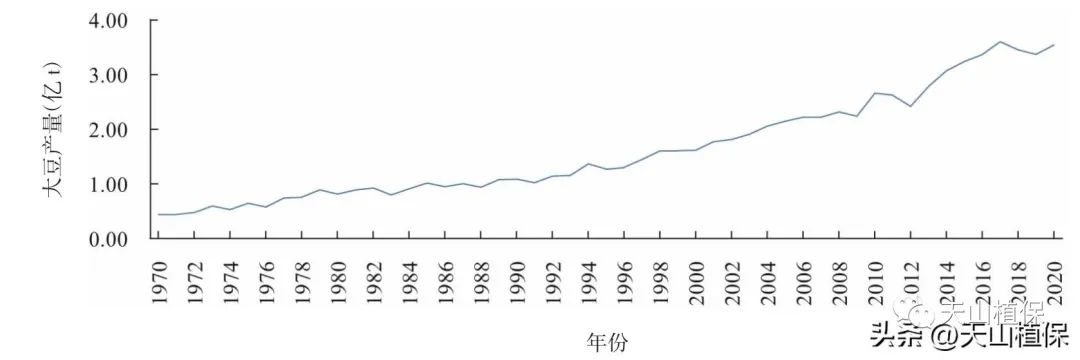 2.1.2世界大豆種植面積和產量變化情況 據聯合國糧食及農業組織數據顯示,1970—2020年,世界大豆種植面積呈逐年增加趨勢,從1970年的0.30億hm2增至2020年的1.27億hm2,增 長 到4.2倍(見圖1)。如圖2所示,世界大豆產量變化趨勢與種植面積變化趨勢一致,呈逐年增加趨勢,從1970年的0.44億t增至2020年的3.53億t,增長到8.0倍。