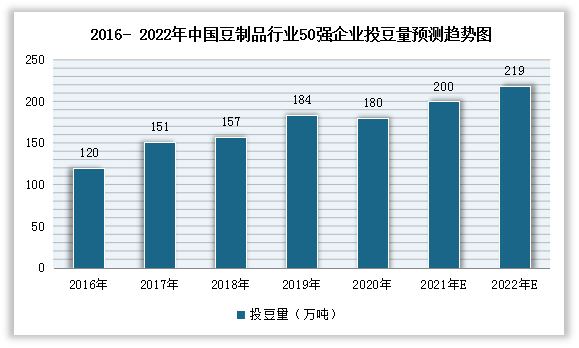 自2016年以來,我國大豆深加工投豆量呈現逐年增長趨勢。數據顯示,2020年我國豆制品行業50強規模企業投豆量從2016年的120萬噸增長至180萬噸,年均復合增長率達12.67%。預計到2022年投豆量將進一步增長至219萬噸。