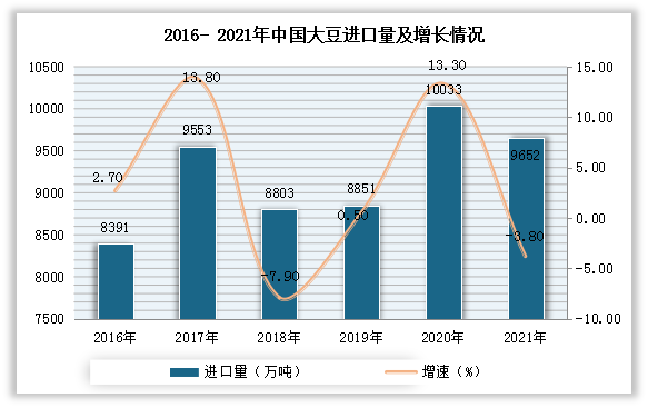從進口市場來看,我國是全球大豆重要的進口國之一。盡管我國大豆產量近年來有了較大提升,但是國內消費需求強勁,使得我國大豆進口量不斷增加,大豆進口依存度仍然較高。進入2021年,受全球疫情影響,我國大豆進口量小幅下降,但進口金額呈現增長。數據顯示,2021年中國大豆進口量達9652萬噸,同比下降3.8%;大豆進口金額達53539.2百萬美元,同比增長35.4%。