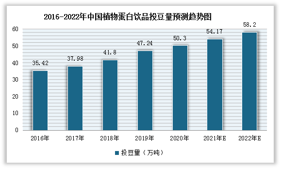 自2016年以來,我國用于植物蛋白飲料的投豆量逐年增長。數據顯示,2020年我國50強規模企業用于植物蛋白飲料的投豆量從2016年的35.42萬噸增至50.3萬噸,預計到2022年投豆量可達到58.2萬噸。
