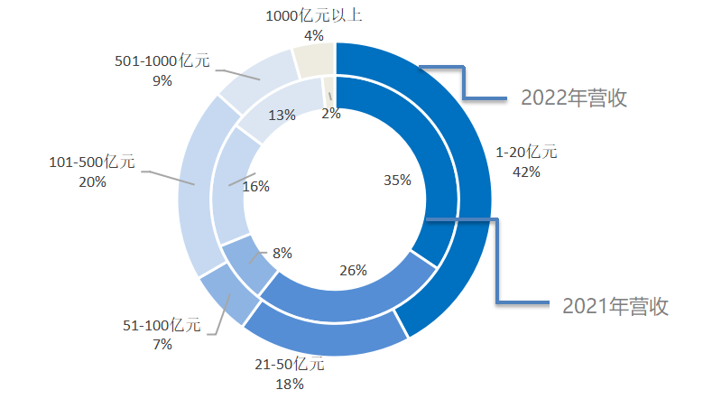 2022年的企業(yè)營收數(shù)據(jù)與2021年相似,50億元營收以內(nèi)的企業(yè)占比約六成;100億元以上的企業(yè)僅占比三成多,其中100-500億元的企業(yè)占比相較2021年有所增加,達(dá)20%,500億元以上的企業(yè)仍較少,僅有13%。