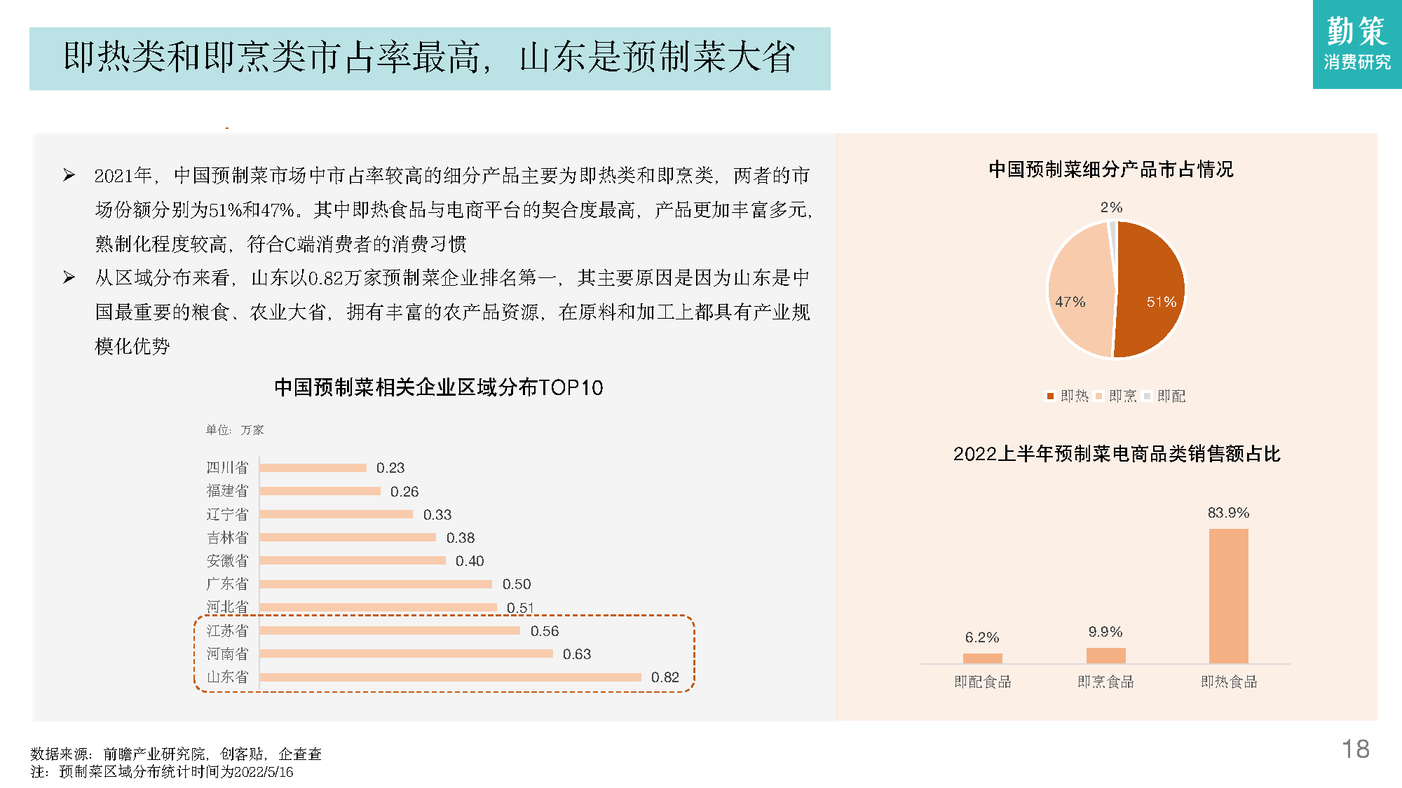 即熱類和即烹類預(yù)制菜市場占有率最高,其中山東地區(qū)成為預(yù)制菜的發(fā)展熱點(diǎn)。即熱類和即烹類預(yù)制菜以其方便快捷的特點(diǎn)受到消費(fèi)者的廣泛歡迎。
