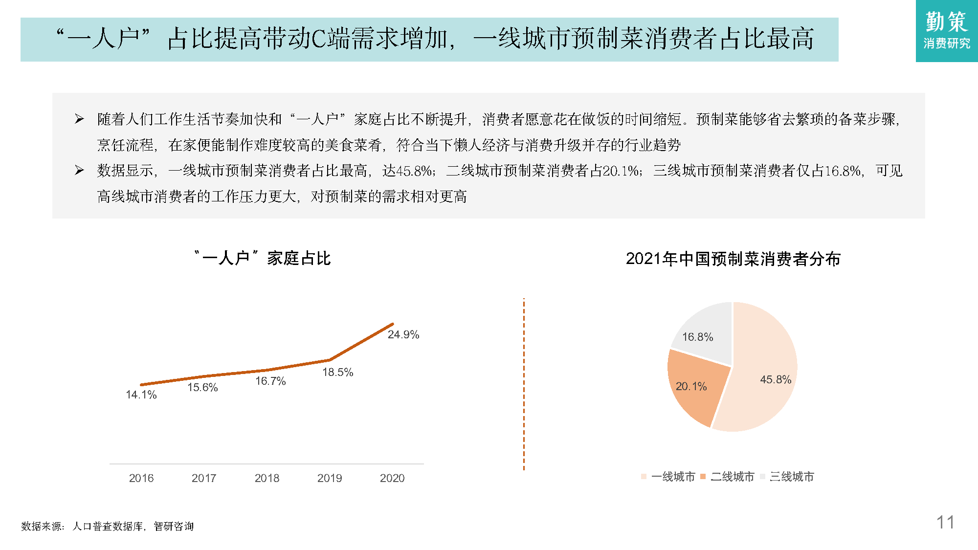隨著“一人戶”人口占比的提高,C端對預(yù)制菜的需求也在逐步增加。在一線城市,預(yù)制菜消費(fèi)者的占比最高,居民們忙碌的生活節(jié)奏使得他們更加依賴方便快捷的預(yù)制菜產(chǎn)品。