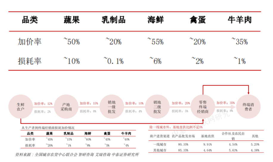 層層周轉導致層層加價和損耗。根據艾瑞咨詢的數據,我國主要生鮮總加價率在100%以上,不易儲存的蔬果損耗最為嚴重,損耗率達20%以上。