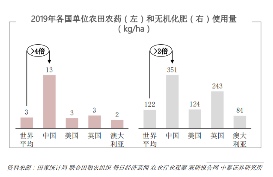 2.單位面積農藥化肥使用量高。數字化精準種植技術不夠普及,提高農業產值依賴農藥與化肥的使用,容易造成對土地的污染,農藥殘留也帶來了食品安全隱患。根據世界糧農組織的數據,2019年,中國是最大的農藥使用國,耕地面積為世界7%,但農藥使用量占世界總量的42%,遠遠領先于美國和巴西。