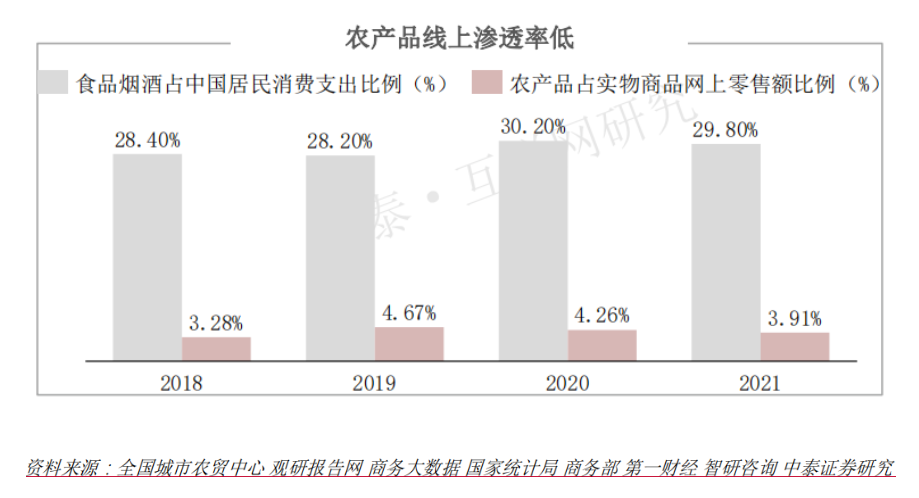 農產品等食品支出占居民總消費支出的比例大,但農產品占網絡零售額比例卻極低,兩相對比,更顯農產品線上滲透率低的現狀。根據國家統計局的數據,2020年,中國居民消費支出中,食品煙酒占比高達30%,而從占全國網絡零售額的比例來看,糧油+食品占比僅6.67%,農產品占比更是不足5%。