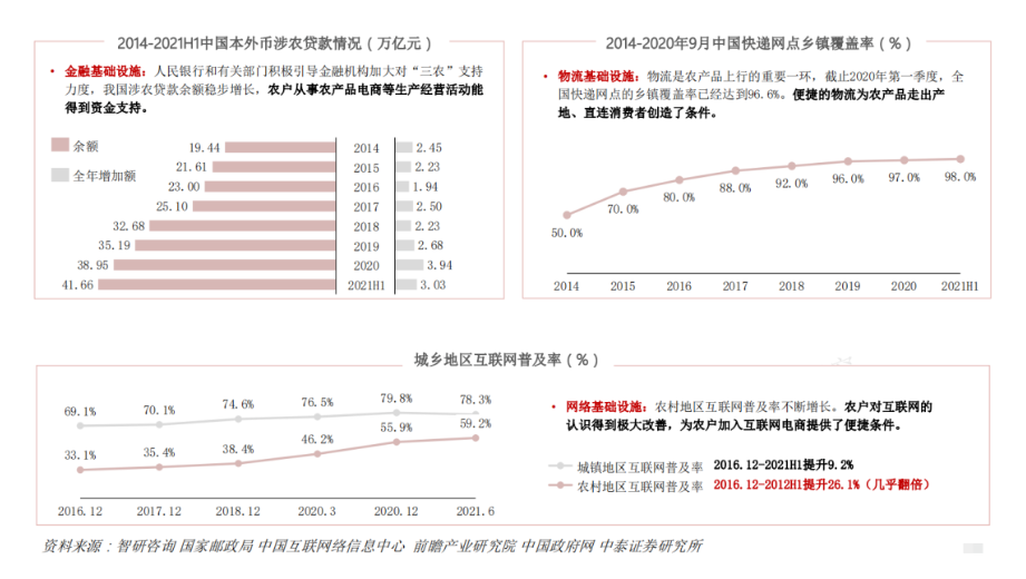 (八)農產品上行基礎設施日漸完善,從網絡、物流、資金三方面,為農戶參與互聯網 電商、農產品走出產地提供支持