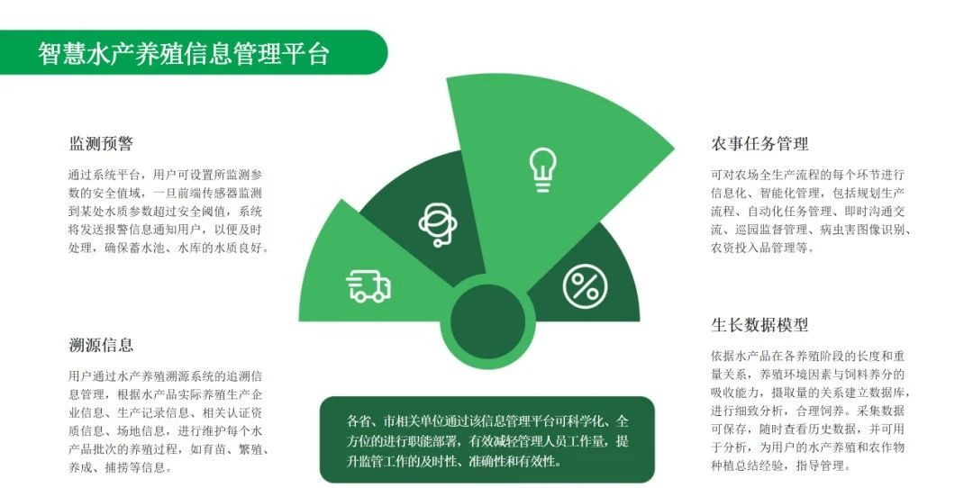 該方案通過物聯網、大數據、云計算等技術,實現對養殖環境、水質、水產品生長狀況等全方位監測管理,提升水產養殖的精準性、科學性和管理效率。