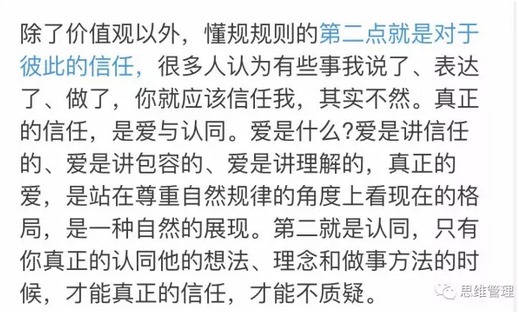 那么,什么是懂規則?我認為懂規則的第一點就是高度的價值觀的認同,如果價值觀的認同不夠,就算再往一起走、往一起撮,都是沒有前提的。