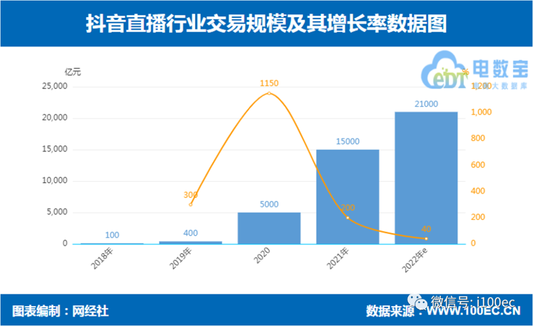 據網經社“電數寶”電商大數據庫顯示,預計2022年抖音電商直播交易規模為21000億元,增速為40%;2021年抖音直播電商的交易規模為15000億元,增速為200%。從2018年-2020年分別為:100億元、400億元、超5000億元,2019-2021年增速分別為:300%、1150%、100%。
