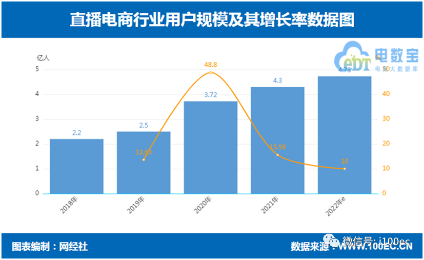據 “電數寶”電商大數據庫顯示,直播電商滲透率預計在2022年達24.1%,增長率為34.11%,增速降緩。從2018年-2021年的滲透率分別為:1.6%、4.3%、8.6%、17.97%,增速依次為:492.59%、168.74%、100%、108.95%。