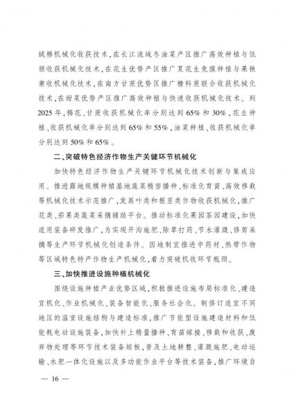 其中,到2025年,棉花、甘蔗收獲機械化率分別達到65%和30%,花生種植、收獲機械化率分別達到65%和55%,油菜種植、收獲機械化率分別達到50%和65%;塑料大棚、日光溫室和連棟溫室為主的種植設施總面積穩定在200萬公頃左右。