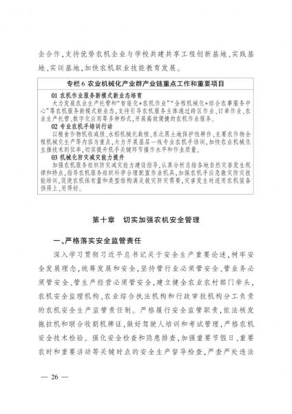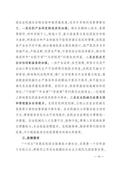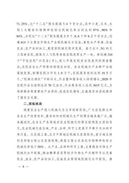 《規劃》顯示,到2025年,全國農機總動力穩定在11億千瓦左右,農機具配置結構趨于合理,農機作業條件顯著改善,覆蓋農業產前產中產后的農機社會化服務體系基本建立,農機裝備節能減排取得明顯效果,農機對農業綠色發展支撐明顯增強,機械化與信息化、智能化進一步融合,農業機械化防災減災能力顯著增強,農機數據安全和農機安全生產進一步強化。