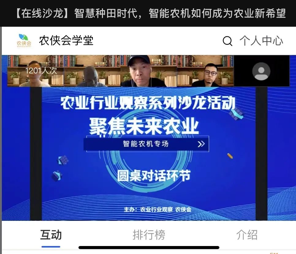 2022年9月13日下午15:00 農業行業觀察、農俠會牽頭組織“未來農業”系列沙龍活動成功帷幕,吸引了來自農機、農資、種植類、智慧農業公司、政府、資本方等1000多人在線參與。本次活動是“智能農機”專場,主辦方還邀請了山東超星智能科技有限公司(簡稱:超星智能)總經理/安華明、北京博創聯動科技有限公司(簡稱:博創聯動)市場副總裁/楊子、北航投資(大慶)科創負責人陳春利、農業行業觀察創始人李劍、農業行業觀察聯合創始人南風共同探討未來智能農機發展趨勢及商業化落地應用。