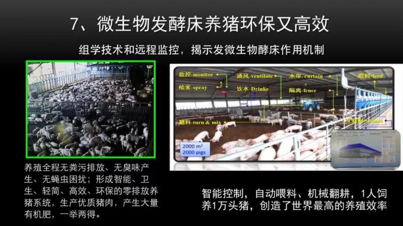 微生物發酵床養豬,環保又高效,我們跟中農院的科學家們一起,用組學方法,用遠程監控的方法,揭示微生物發酵床的作用機理,在這樣一個豬欄里面存放4500頭豬,那么它的光、溫、水、濕、飼料和喝的水,全部自動化,用機械翻耕,所以一個人一年可以管1萬頭豬,是世界上,養豬效率最高的一種方法。整個過程沒有污染,沒有臭味,沒有蠅蟲,形成的智能、衛生、清潔、環保、高效的這么一個零排放養豬系統。同時生產出優質的豬肉,生產出大批的有機肥,給我們帶來了很多效益。那么微生物發酵床,它具有無臭消納豬糞的能力,豬把糞一拉到發酵床的墊料上面,墊料會迅速的將臭味吸附到墊料里面去,接著微生物開始工作,慢慢地一步一步把臭味消納掉。