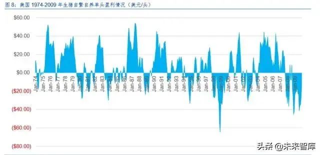 通過分析美國 1974-2009 年生豬自繁自養月度單頭盈利曲線的歷史走勢,我們發現在快速規模 化之前和初期,盈利曲線位于盈虧平衡線上方的時間寬度和盈利深度均要明顯大于盈虧平衡線下 方的部分。然而,伴隨著規?;M程的推進,盈虧平衡線上方和下方盈利曲線的對稱性趨于增強。