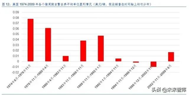 單位盈利曲線對稱性明顯提升給生豬產業帶來什么影響?從 1974 年到 2009 年,美國豬價大致 可以劃分出 1974 年 6 月-1976 年 11 月、1976 年 11 月-1980 年 4 月、1980 年 4 月-1983 年 11 月、1983 年 11 月-1988 年 11 月、1988 年 11 月-1992 年 1 月、1992 年 1 月-1994 年 11 月、 1994 年 11 月-1998 年 12 月、1998 年 12 月-2002 年 11 月、2002 年 11 月-2009 年 8 月等 9 輪 豬周期。在假設生豬銷售數量在時間軸上均勻分布的情況下,我們發現快速規?;昂统跗诘闹芷趩晤^盈利水平要明顯高于規模化成熟階段的周期單頭盈利水平。隨著規?;M程的推進,豬 周期為單位的單頭盈利水平處于下行趨勢,這主要是由單位盈利曲線對稱性明顯提升所導致。