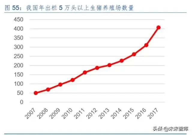 與美歐日等國家和地區生豬產業規?;膭右虿煌耆嗤?,我國生豬養殖行業是在城鎮化、勞動力機會成本上升、豬肉產銷量增速放緩、豬飼料行業飽和促使飼料企業往下游養殖延伸、環保壓力加大等多因素的驅動下,逐漸進入類似美歐日的規?;M程,小散戶加速退出,中大規模 養殖場(企業)市場份額持續增加。一方面,我國年出欄 500 頭以下的生豬養殖場數量在持續 減少;另一方面,我國年出欄 50000 頭以上的生豬養殖場數量在持續增加。2007-2017 年,我 國出欄 50 頭以下的養殖戶數量減少了 55.41%、出欄 50-99 頭的數量減少了 23.35%,出欄 5000-9999 頭的養殖場數量增加了 142.71%、出欄 10000-49999 頭的養殖場數量增加了 129.28%、出欄 50000 頭以上的養殖場數量增加了 714%。伴隨著規模化進程的推進,我國生豬 產業的生產效率也在逐漸提升,例如我國生豬的 MSY 水平從 2009 年的 13 上升至 2018 年的接 近 20。歐美先進國家 MSY 平均水平在 26,丹麥全球最高,已經突破 30,我國生豬產業的生產 效率仍有很大的提升空間。