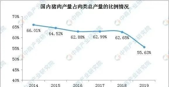 2014年-2018年,國內(nèi)肉類產(chǎn)品的生產(chǎn)結(jié)構(gòu)中,豬肉產(chǎn)量占比均超過60%,超過牛肉、羊肉和其他肉類的總和,反映豬肉在我國食品消費中的重要地位,國內(nèi)市場對豬肉存在巨大的市場需求。2019年,受環(huán)保政策、規(guī)模化養(yǎng)殖趨勢、“非洲豬瘟”等因素疊加影響,生豬出欄量下降,進而導(dǎo)致豬肉產(chǎn)量也出現(xiàn)較大幅度的下降。2019年全年豬肉產(chǎn)量4,255萬噸,同比下降21.26%,豬肉產(chǎn)量占肉類總產(chǎn)量的比例下降至55.63%。