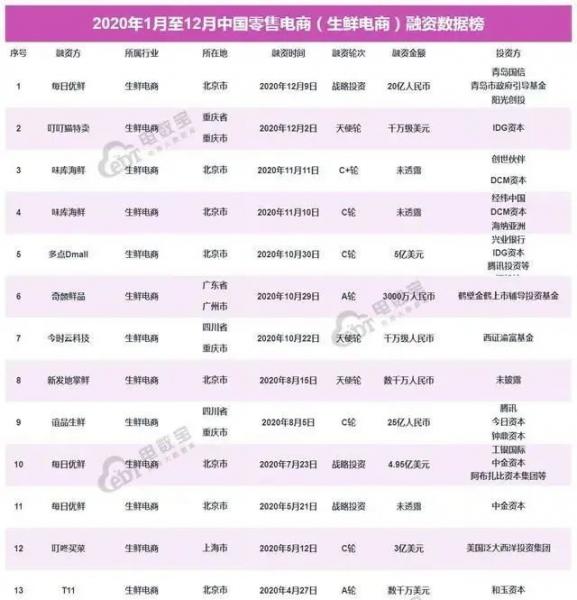 1、數(shù)據(jù)匯總:2020年生鮮電商融資總額達136億