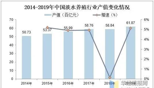 中國淡水養殖行業相對于海水養殖來說發展時間較長,產業結構較完善,產值也比海水養殖大。根據《中國漁業統計年鑒》數據顯示,2014-2019年中國淡水養殖行業產值呈現上升趨勢,到2019年中國淡水養殖行業產值上升至6187億元,相對于2018年上升了5.1%。